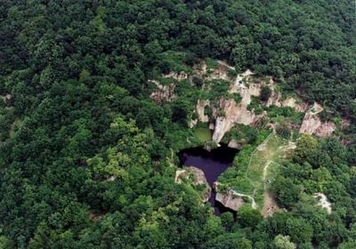 The Megyer-hegyi Tarn consists of a water-filled rock basin surrounded by vertical walls reaching 70 meters, with a depth of 6.5 meters.