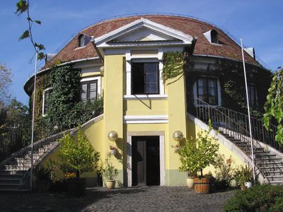 The Selyemgombolyító features an oval floor plan and a curved staircase leading to two entrance doors on its main facade.