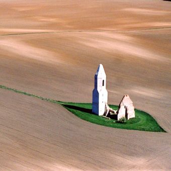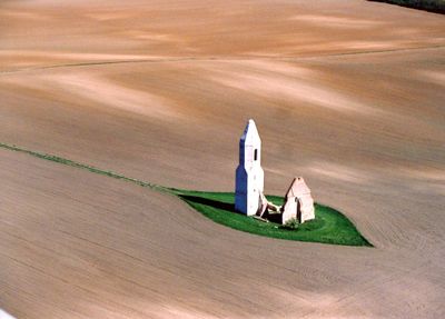 The brick ruins of this Gothic church feature an octagonal tower and fragments of the eastern chapel wall standing in cultivated fields.