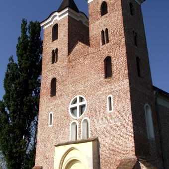 The Saint James Church features brick construction with a single nave, two western towers, and a simple apse design characteristic of Árpád period architecture.