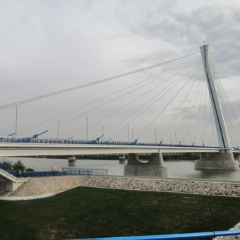 The Monostor Bridge extends 622 meters across the Danube River with an inclined asymmetric cable tower supporting two lanes for vehicle traffic and bicycle paths.