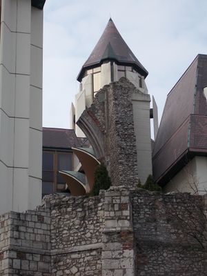 The remaining walls and tower of Saint Nicholas monastery stand integrated within the structure of the Hilton Budapest hotel at Castle Hill.