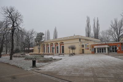 The Erzsébetliget Theatre features socialist realism architecture with dedicated spaces for performances, exhibitions, workshops, and community gatherings throughout its multiple rooms.