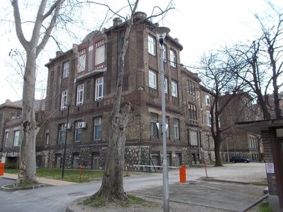 The First Department of Surgery exhibits eclectic architecture with a symmetrical facade, large windows, and decorative stone elements throughout its structure.