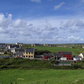 Doolin is a village on the Atlantic coast near Burren National Park, spread out across winding roads with scattered housing and farms. A pier provides regular ferry connections to the Aran Islands and boat tours of the nearby Cliffs of Moher.