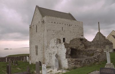 Clare Island Abbey is a monastery ruin in County Mayo featuring a rectangular nave, a two-story tower, and a chancel. The structure displays typical medieval construction with thick stone walls and a tower that rises prominently above the other sections.