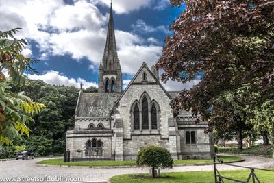 All Saints' Church stands on Howth Road with walls surrounding its grounds, featuring mature trees and an octagonal spire with a weathervane.