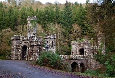 Arthur Keily-Ussher constructed these elaborate entrance towers in 1834 to precede a grand mansion that remained unbuilt due to financial limitations.