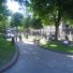 The park extends between Grand Parade and South Main Street, featuring bronze fountains, sculptures, and stone pathways through green spaces.