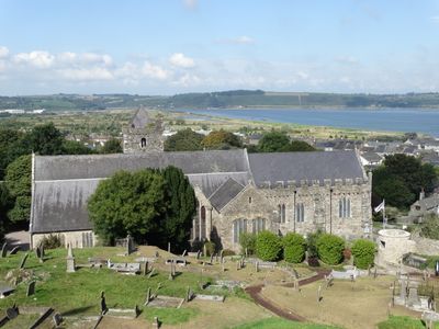 The interior contains 15th-century choir stalls with detailed carvings, the tomb of Richard Boyle, and an alabaster monument commemorating Sir Walter Raleigh.