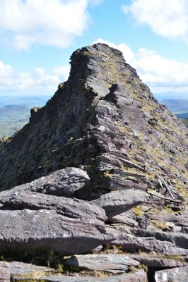 The mountain's narrow rocky arête formation between Cnoc na Péiste and Cruach Mhór creates technical climbing conditions rare in Irish mountaineering.