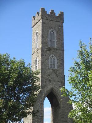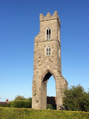 The Magdalen Tower springs from a Gothic arch and rises through two additional stories connected by a spiral staircase at the northern part of Drogheda.