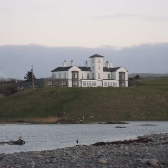 Moy House stands on a slope with two levels, presenting a single-story facade while the lower floor contains a dining room and library facing the Atlantic Ocean.