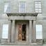 Townley Hall is a limestone residence featuring neoclassical design elements throughout its structure, including a Doric portico at the main entrance. The interior centers around a rotunda with a cantilever spiral staircase, apses, and arched recesses that define its architectural character.