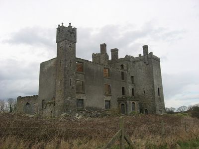 The castle consists of a central tower house with remaining walls standing tall against the Irish countryside near the Nanny-Water River.