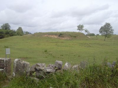 The site features a central mound measuring 20 feet in height with a flat top of 100 by 80 feet, surrounded by a fosse and external bank.