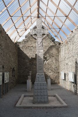 The cross sits about one kilometer west of Moone village under a protective roof at the remains of an early monastery. Access is through a wooden door set into the stone wall, and the grounds around it preserve traces of the monastic settlement.