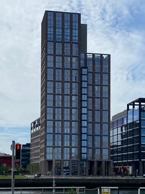 Capital Dock stands 79 meters tall with 22 floors, combining residential units, office spaces, and retail establishments along the River Liffey waterfront.