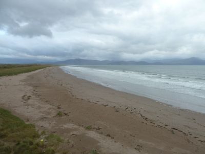 Inch Beach is a broad sandy shore in County Kerry that extends as a natural spit into Dingle Bay and is framed by mountains. The firm sand covers a large area between the land and water, with conditions varying between calm and rough depending on weather.