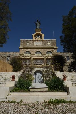 A bronze statue of the Virgin Mary, measuring 6 meters in height, stands prominently on the church facade above the inscription 'Reginae Palestinae'.