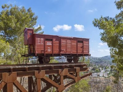 The memorial features an authentic German railway cattle car positioned on railroad tracks extending over a cliff near Jerusalem mountains.