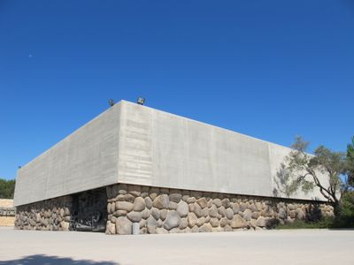 Ohel Yizkor is a square-shaped structure with walls of basalt stones from the Beit She'an Valley and a concrete pyramid roof that allows natural light to filter through perimeter slits. An elevated concrete bridge inside guides visitors across the central chamber, creating a narrow passage surrounded by the stone walls.