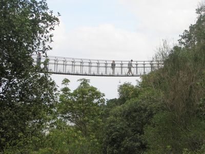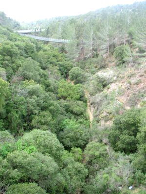 The park contains two suspension bridges spanning 70 meters across Katia Stream, with marked trails leading to prehistoric caves and picnic areas.