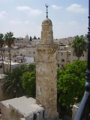 The mosque stands between the Armenian and Jewish quarters, representing an intersection of religious communities within the Old City of Jerusalem.