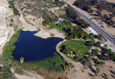 The park contains natural pools fed by the Revivim River and geothermal springs, surrounded by landscaped lawns and shaded groves.