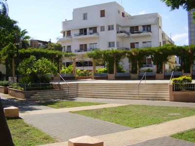 The garden functions as a gathering spot for community events and social meetings, reflecting the outdoor lifestyle of Tel Aviv residents.