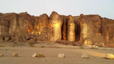 The adjacent Egyptian temple, dedicated to mining goddess Hathor, contains wall engravings depicting King Ramses III making ceremonial offerings.