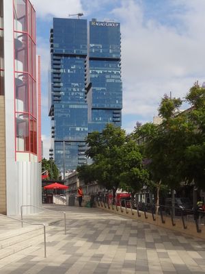 The towers, completed in 2017 after five years of construction, stand on HaArba'a Street, named after four Haganah members who died in 1946.