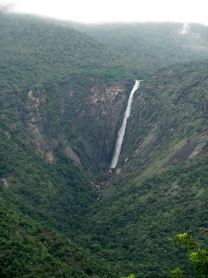 Thalaiyar Falls is a waterfall in Kodaikanal where water cascades down a steep drop, creating a thin line of water against the mountain landscape of Tamil Nadu's Western Ghats. The flow descends from high above, forming a striking sight as it falls through the forested terrain.