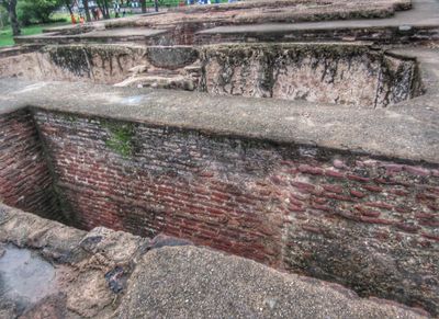 The Purana Qila spans over 1.5 kilometers of perimeter walls, constructed with red sandstone blocks and protected by a wide water-filled moat.
