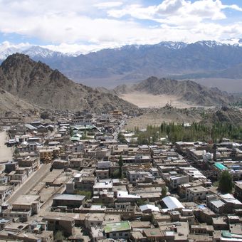 Leh is a mountain town in Ladakh, northern India, and the largest settlement in the Leh district. It sits in a wide valley surrounded by barren mountains, with narrow lanes running between flat mud and stone houses and several monasteries plus the ruins of an old palace visible on hills above.