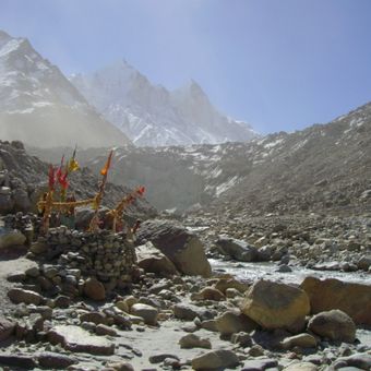 The glacier terminus is called Gomukh, meaning cow's mouth, referring to the shape in which the ice opens to release the river. Pilgrims gather here to pray at the water's edge and collect what they believe to be sacred water.