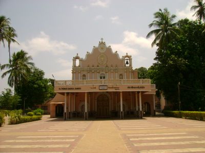 The St. Thomas Sandor Church features traditional Indian architectural elements and stands at coordinates 19.366539 latitude and 72.804165 longitude in Palghar district.