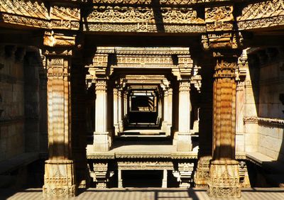 The Adalaj Stepwell extends five stories underground with an octagonal design, featuring stairs that lead to water through multiple levels of carved stone structures.
