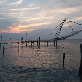 Fort Kochi is a coastal neighborhood on the Arabian Sea in the southern Indian state of Kerala, spreading across a narrow peninsula overlooking the natural harbor. Whitewashed churches stand next to old brick warehouses while shady avenues lined with rain trees lead to public squares where fishermen repair and dry their nets.