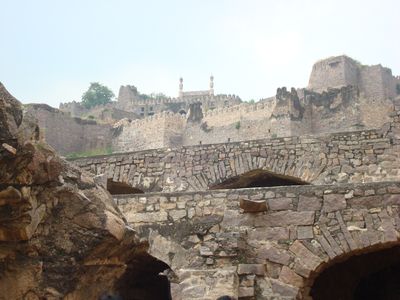 The name comes from the Telugu words Golla Konda, meaning shepherd's hill. Visitors today still notice the yellow diamond market ruins inside the walls, where gemstones from nearby mines were once traded.