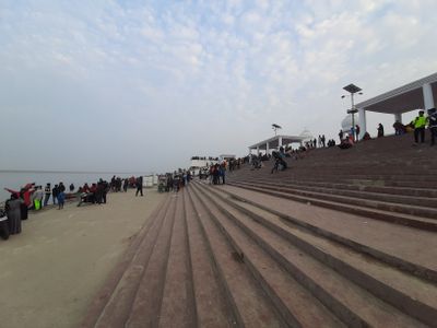 The Gurdwara Gobind Ghat stretches along the banks of the Ganges River, featuring a gateway entrance and traditional Sikh architectural elements at its entrance.