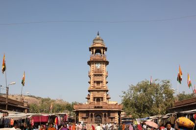 The clock tower marks the beginning of Old Jodhpur and functions as a central meeting point where merchants display textiles, spices, and local crafts.
