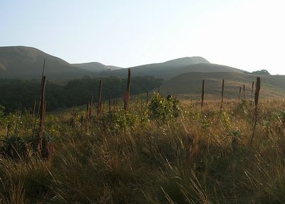 Grass Hills National Park spreads across the Western Ghats with open grasslands mixed with dense forests at high elevations. The landscape changes between wide meadows, scattered trees, and thick woodland areas.