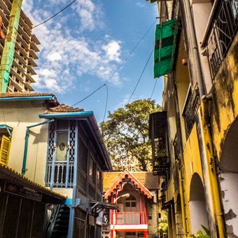 Khotachiwadi features wooden houses with open front verandahs, back courtyards, and external staircases leading to upper bedrooms in Portuguese architectural style.