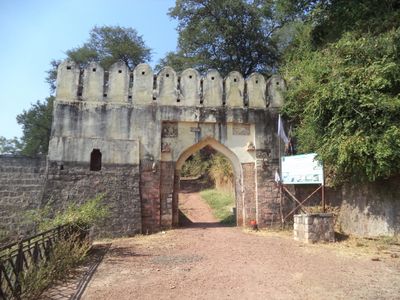 The entrance gate displays a carved Naga relief image, distinguishing the fort's heritage from local legends attributing its construction to Gond rulers.