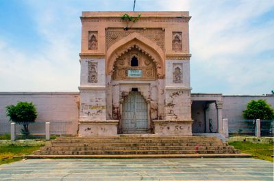Lal Darwaza Masjid is an Islamic place of worship in Begumganj with three entrance gates that open into a central courtyard where visitors and worshippers gather. The structure contains pillars with ancient inscriptions that document the names and details of historical rulers from centuries past.