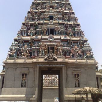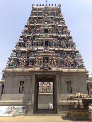 The temple features a five-story Gopuram at the southern corner and contains an outer mandapam built with black marble around the inner sanctum.