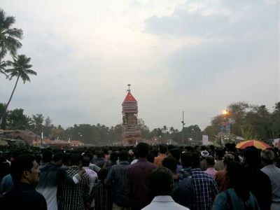 During the Vishu festival, the temple fills with devotees participating in ceremonial offerings, traditional music performances, and religious processions through surrounding streets.