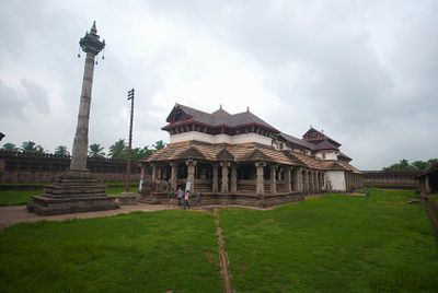 The temple features three floors with granite lower levels, wooden upper levels, and numerous pillars adorned with detailed carvings throughout its structure.