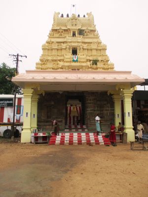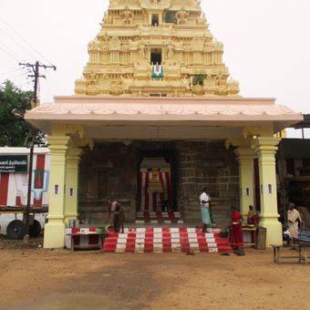 The temple features traditional Dravidian architecture with stone carvings, sculptures, and a pyramidal tower rising above the main sanctuary.